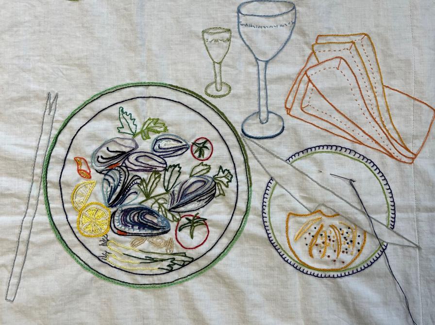 Kvinderne broderer hver især på et gammelt hvidt pudevår, som er sprættet op og foldet ud. På hvert pudevår skal de brodere to tallerkner, to knive og to gafler. Derudover er der frit slag; man må brodere flotte mønstre og mad på tallerknerne, servietter, skeer, glas, vandkaraffel, blomster osv. osv. - og alle mulige farver og sting er tilladt. Lige hvad evner og lyst rækker til.